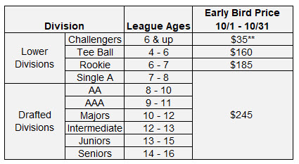 Team Assignment: Coach/friend requests are considered for Challenger, Tee Ball, Rookie and Single A divisions, but not guaranteed. If you have a request, please make sure to note it during registration in the field provided. Coach/friend requests cannot be considered for the AA and above divisions, as team assignments are determined via the draft process. Team assignments will be announced mid/late January.
